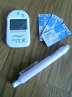 画像は、AkiRaが2007年1月時点で使用している血糖測定用セット(血糖測定器、採血用穿刺器具、測定用チップ)。